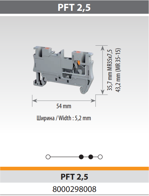 8000298008 Клеммник на DIN-рейку (Push-in) 2,5 мм² (серый); PFT 2,5; уп.100шт